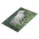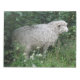 Este notável bloco apresenta uma fotografia de uma ovelha fofa. As ovelhas estão cercadas por flores silvestres e erva comprida e comem algumas folhas de forma vertiginosa. Tem um casaco de lã branco grosso e um nariz preto fofo.