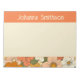 Este grande bloco de anotações personalizável, horizontal, de 8,5x11, inspirado nos anos 70, apresenta seu nome em uma delicada fonte de vintagem encaracolada em um fundo de pêssego de melão com um trim de ilustração floral cor de laranja retrógrado. A área de escrevendo espaçosa é uma cor de baunilha suave.
