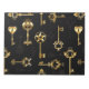 Padrão perfeito de chaves antigas, douradas e silhuetas em fundo preto.