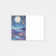 Notas pegajosas com uma bela ilustração. Vírus caprichoso e fantasioso. Uma lua grande brilhando com estrelas ao redor. Passando por uma bela paisagem de árvores, montanhas e um rio sinuoso. Incrível vibração mística mágica.