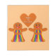 Este notável bloco de notas apresenta uma imagem de arte digital de um casal lésbico giro. As moças de pão de gengibre têm pestanas bonito e vestem batom vermelho. Eles têm saias de franja e topos. O zunido em suas roupas combina com as cores da bandeira do orgulho. Ambos têm um grande sorriso. Há um coração de pão de gengibre sobre o casal mostrando seu amor um pelo outro. Há o dentro branco que diz "feito um para o outro".