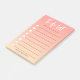 Nota moderna e prática que o ajudará a organizar seus dias! Esta lista de verificação tem linhas e círculos onde você pode verificá-los à medida que as tarefas são concluídas. Um grande ajudante para fazer as coisas sem procrastinar! O fundo é uma bela cor de pêssego. Personalize este produto adicionando seu nome na parte inferior.