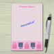 Inspiração e peculiar, para negócios, para casa, para escola. Na próxima vez que você tiver uma nota ou lembrete para escrever, olhe para ela de uma perspectiva diferente, viva sua melhor vida, e "PENSE FORA DA CAIXA". Logotipo rosa profundo e marinho; fundo rosa pálido; texto rosa profundo.