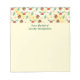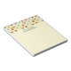Um bloco de notas com um padrão fofo com cones de pínus e holly sobre um fundo de aquarela amarela com pequenos círculos brancos espalhados por aí.