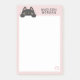 Bloco de notas adesivas cor-de-rosa com um gatinho cinza escuro fofo com patinhas e bochechas rosadas e olhos verdes. Uma impressão de pata na parte inferior da página em rosa pálido. Adicione seu nome em letras cinza escuras. Um bloco de notas adesivas de animal fofo.