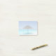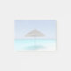 Notas pegajosas com uma fotografia de uma praia tropical cênica nas Maldivas. Uma praia branca arenosa e águas azuis cristais com um guarda-chuva compacto a solo. Secudido e sereno.
