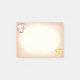 Rato branco fofo e queijo em notas adesivas bege.