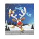 Um divertido rena de desenho animado com um nariz vermelho brilhante e grandes chifres brancos, adornado com um laço vermelho e dourado, espreita por uma janela aberta. Do lado de fora, uma paisagem nevada com pinheiros silhuetados e uma pequena casa iluminada é visível sob um céu noturno azul escuro cheio de estrelas. O trenó do Papai Noel puxado por renas está voando ao longe. A cena evoca uma atmosfera festiva e caprichosa de Natal. Arte Vetorial Original Copyright BluedarkArt TheChameleonArt.