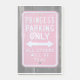 Uma fotografia de um cartaz de estacionamento rosa, engraçado e humorístico, que diz que o lugar é reservado apenas para a princesa e todos os outros serão bronzeados...