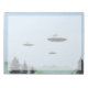 Uma aquarela, caneta e tinta, e desenho a cores de lápis de três OVNIs de disco sobre as montanhas.