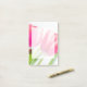 Notas pegajosas com uma bela fotografia de primavera com 2 tulipas cor-de-rosa e folhas verdes brilhantes.