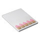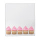 Cinco cupcakes de baunilha com glacé rosa na parte inferior deste bloco de notas com bastante espaço escrevendo.