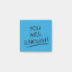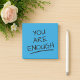 Você é suficiente notas adesivas positivas. Notas azuis com a mensagem em negrito "você é suficiente" com um sublinhado impresso sobre ela. Use essas notas positivas maravilhosas para se lembrar de que você é bonita o suficiente, inteligente o suficiente, forte o suficiente, boa o suficiente e tudo o que é suficiente. É uma ótima ferramenta para usar contra a ideia de que não somos bons o suficiente e não somos dignos de felicidade e coisas boas na vida. Além de usá-las no autodesenvolvimento, você também pode usá-las para fazer atos de bondade aleatórios. Cole-as em vários lugares e deixe que seus amigos, colegas de escola, bem como estranhos as encontrem e se sintam animados e dignos.