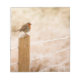 Design apresenta uma fotografia de um belo pássaro vermelho-assado-assado num poste de feno.