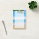 Notas adesivas de grande tamanho personalizadas com suas próprias informações. Uma fotografia de uma praia tropical. Água azul e céu azul com ondas suaves que caem na costa com algumas nuvens à distância. Algumas folhas tropicais no topo. Uma cobertura semitransparente com uma borda dourada no centro para escrevendo legível.
