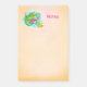 Notas pegajosas de grande porte com uma ilustração fofinha de um lagarto tropical verde rodeado de folhas e flores de cor azul-turquesa. O fundo é uma cor bege claro.