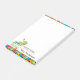 Esta almofada de nota do Cargo-it® 4x6 caracteriza um gráfico de um leitor ávido verde que senta-se sobre uma pilha de livros. A nota do Cargo-it® é acentuada com as listras coloridas preliminares na parte superior e na parte inferior. A parte inferior da almofada lê "UMA NOTA DE" com texto customizável para o nome do professor. Isto faz um grande presente do professor.