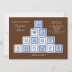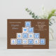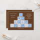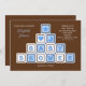 Este convite para o chá de fraldas de menino giro é desenhado com blocos de bebês azuis e brancos — alguns tendo dentro design e outros explicando as palavras "CHÁ DE FRALDAS". Os blocos são apresentados sobre fundo marrom-chocolate, assim como os detalhes do convite que aparecem em branco e o nome da mãe, que aparece em azul. Direitos autorais