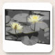 Esta imagem fora do quadro apresenta dois lírios de água delicados em matizes macios, amarelo-pálidos, destacando-se claramente contra um pano de fundo de almofadas, lírios cinza e água. As flores estendem-se para além do quadro delimitado por preto, criando um efeito dinâmico, quase tridimensional. O contraste entre os florescentes vibrantes e os subjugados arredores destaca a delicada beleza e tranquilidade da cena, evocando um senso de calma e elegância silenciosa.