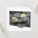 Esta imagem fora do quadro apresenta dois lírios de água delicados em matizes macios, amarelo-pálidos, destacando-se claramente contra um pano de fundo de almofadas, lírios cinza e água. As flores estendem-se para além do quadro delimitado por preto, criando um efeito dinâmico, quase tridimensional. O contraste entre os florescentes vibrantes e os subjugados arredores destaca a delicada beleza e tranquilidade da cena, evocando um senso de calma e elegância silenciosa.