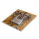 Fotografia de um cadeado de "cadeado de amor", de cor dourada, em dois anéis de uma porta antiga.