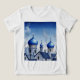 The image shows a watercolor painting of a blue and gray cityscape, characterized by European or Russian architecture, with domes, spires, and a cross on some of them.