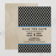 Quatrefoil Chic Elegante e moderno Salve o Anúncio de Data com um plano de fundo marroquino de tendência, um papel de vintage com o olhar de fundo e um par de listras azuis reais finas. Este na moda para salvar o convite de data é fácil de personalizar com seus detalhes de casamento. Clique em "Personalizar" para encontrar mais opções de personalização.