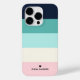 Cute minimalist and modern cell phone case design with horizontal stripe pattern for her, the model has blue, cream and pink colors with an elegant touch of a heart monogram and the name of the person who receives this cute design. The model is for an IPHONE 14 model but it fits any zazzle model.