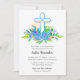 Uma cruz azul e branca, acentuada por verde e flores em tons de azul, é perfeita para os convites de Primeira Comunhão, Christening, Baptismo ou Dedicação. Também disponível em rosa.