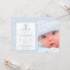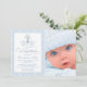 O convite para o batismo da foto do damasco azul com cruz de pérolas azul e branca e um roteiro elegante sobre um fundo do damasco azul bebê. Este elegante convite para batismo de damasco azul é facilmente personalizado para o seu evento, simplesmente adicionando os detalhes da sua fotografia e evento no estilo e cor da fonte, bem como o texto da sua escolha. Este é um design impresso sem pérolas reais, etc.