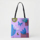 This modern tote bag features a soft blue and purple floral design with a clean, abstract feel.
