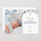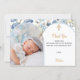 Adicione sua própria foto de tamanho vertical. Um pequeno arco azul colorido em forma de fotograma. Uma cor de fundo branca, decorada com forais azuis, flores. Personalize e adicione um nome e detalhes.
