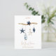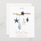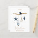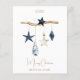 Fundo branco, madeira castanha e decoração de Natal azul e branco. Estrelas azuis e brancas, e uma mulher gnomo azul. Feliz Natal escrito com um roteiro de estilo manchado. Voltar: adicione a mensagem e o logotipo da empresa. Adicione seu código QR ao seu site. 1 folha = 1 convite impresso de borda a borda.
