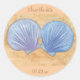 Roxos e conchas azuis, deitados lado a lado na areia, são impressos em Save the date stickers. O texto diz, Salve a data, acima dos conchas. Há também um lugar para digitar na data do casamento abaixo dos conchas, em forma de modelo. Obrigado por comprar em CherylsArt no Zazzle.