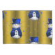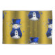 Um padrão de Natal bonito e colorido com neve vestida de chapéu de veludo azul e coletes, sobre um fundo festivo de ouro com estrelas de ouro para adicionar um toque na moda e caprichoso às suas decorações natalinas este ano.