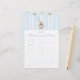 Add a touch of elegance to your teddy bear themed baby boy shower with our sophisticated "Baby predictions and advice" game. Featuring a charming teddy bear wearing a cute blue bow, holding blue balloon, surrounded by blue striped pattern, this delightful activity is perfect for entertaining your guests and creating lasting memories. Ideal for adding fun and excitement to your special celebration!
