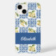 Serene blue tile French country lemon pattern iPhone case featuring a customizable name, to complement your style in the yoga studio and beyond. Personalize with your name or that of a loved one.