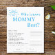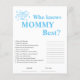 Prepare-se para alguma diversão com o nosso jogo de Chá de fraldas "Quem Conhece Melhor Mamãe" Azul, uma maneira deliciosa de testar o conhecimento da futura mãe dos seus convidados! Nesse jogo, os convidados responderão a perguntas sobre a mãe esperada, como sua comida favorita, seu prazo ou seus desejos. A que tem as respostas mais corretas ganha um doce prêmio! Feito com sotaques azuis encantadores e detalhes adoráveis do coração, este jogo adiciona um toque de doçura às suas festividades de chá de fraldas. É perfeito para envolver convidados e criar risos e memórias juntos.