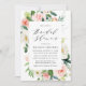 Convite elegante de chá de noiva com detalhes do seu chá de noiva emoldurado por flores de aquarela rosa e branca e folhas verdes exuberantes. Uma escolha moderna perfeita para chás de noiva de primavera e verão.