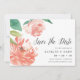 Os cartões salve a data florais elegantes apresentam peônias de aquarela em cor rosa-claro e pêssego, acentuadas com verde-luxuoso. Personalize com seus nomes, data de casamento, local e site de casamento ou informações de convite, abaixo de "salvar a data" em script de caligrafia. Cartões inverter para um sutil fundo de lavagem com aquarela sutil.