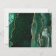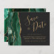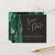 Este elegante orçamento salve o cartão de data apresenta um emerald verde aquarela agate border cortado com falso brilho dourado. O texto personalizável combina um script de manuscrito colorido dourado, fontes copperplate e itálico em um fundo preto de slate. O verso apresenta um design emerald verde e dourado.