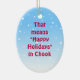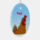 Este modelo cerâmico feito sob encomenda dos enfeites de natal tem uma galinha bonito dos desenhos animados olhá-lo curiosa. Acima da galinha, diz, "Aroo!" Os amantes da galinha sabem este som. A parte traseira diz, "que os meios "boas festas" em Chook." O fundo é céu azul e neve de queda.