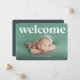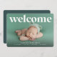 Um design de anúncio de nascimento doce e elegante com um cheio sangrando uma foto horizontal ou orientada à paisagem com "bem-vindo" sobreposto no topo em letras brancas de blocos retrorreflectores. O nome do seu bebê e as estatísticas de natalidade aparecem no fundo. Adicione três fotos quadradas adicionais às costas, juntamente com uma mensagem pessoal.