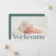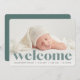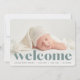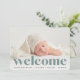 Um design de anúncio de nascimento doce e elegante que apresenta um cheio sangrando fotos horizontais ou paisagísticas com "boas-vindas" sobrepostas em letras retrorreflectoras. O nome do seu bebê e as estatísticas de natalidade aparecem em preto. Adicione três fotos quadradas adicionais às costas, juntamente com uma mensagem pessoal.