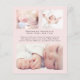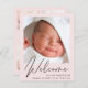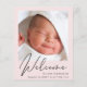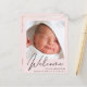 Um anúncio de nascimento de uma menina rosa e pastel. A frente apresenta a foto do seu recém-nascido, o nome do cheio, a data de chegada e as estatísticas de natalidade, e "Bem-vindo" escrito em um roteiro elegante. No verso, adicione três fotos adicionais e nomes de pais e irmãos, e um obrigado para você, visitação ou outra mensagem.