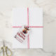 Uma etiqueta de Natal divertida mostra uma vaca adorável fazendo um chapéu de Papai Noel, espalhando alegria de Natal com uma saudação Feliz e espaço para notas personalizadas.