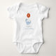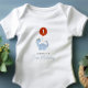 Body Aniversário de 1 ano dos Meninos Dinossauros apresenta um dinossauro azul pastel segurando um balão vermelho com o número 1 dentro do balão em um cenário colorido e divertido com tema de dinossauros. Personalize com a idade e o nome do seu filho.