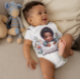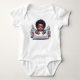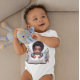 Um menino afro-americano adorável vestindo um body de bebê com uma imagem de uma pintura acrílica de um menino com as mãos preciosas apoiadas na sua almofada.