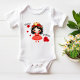 Linda princesinha com rosas vermelhas, vestido vermelho e cabelo escuro