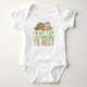 Este macacão para um menino ou menina tem uma preguiça marrom e o ditado "Não sou preguiçoso, apenas trabalho duro para descansar" contra um fundo branco.